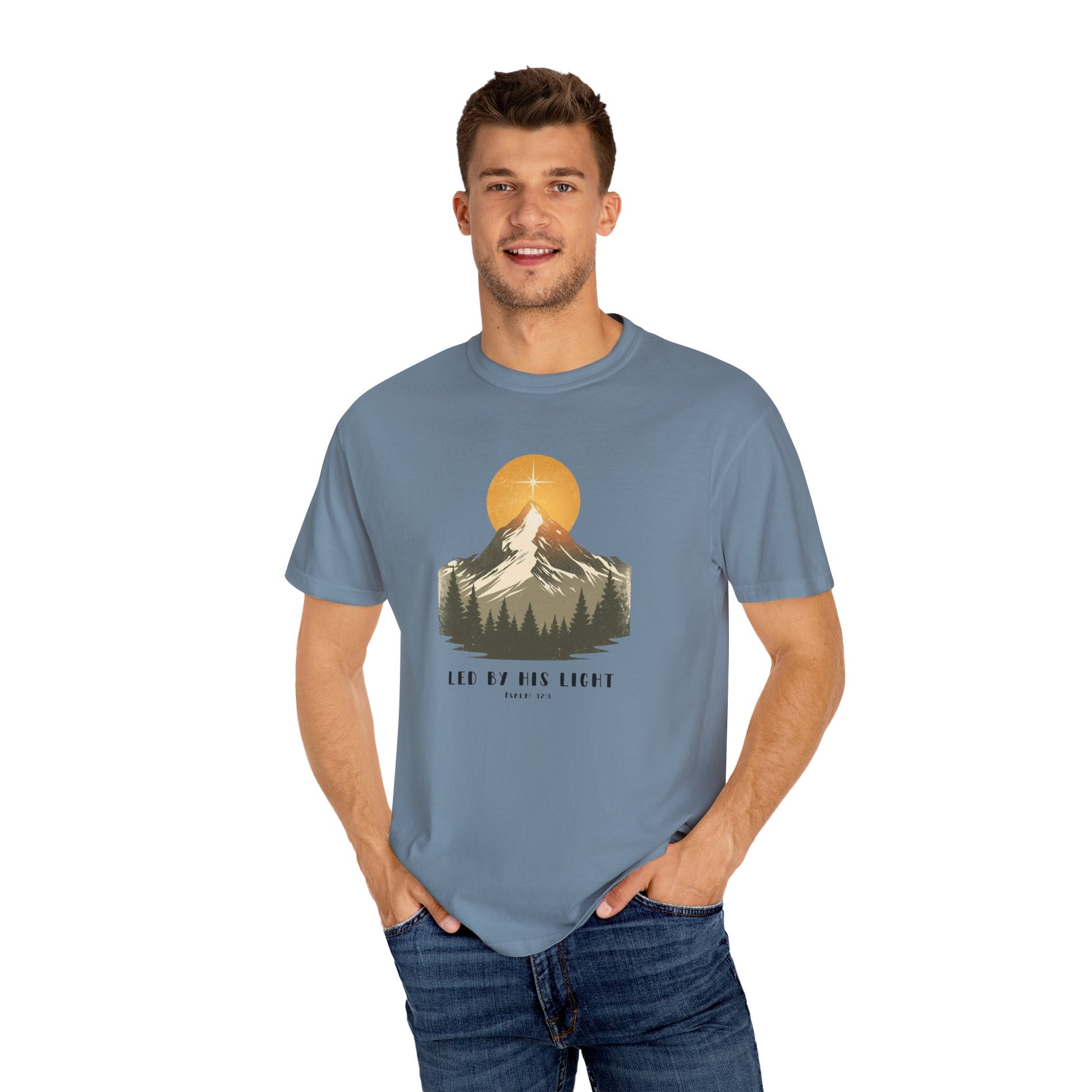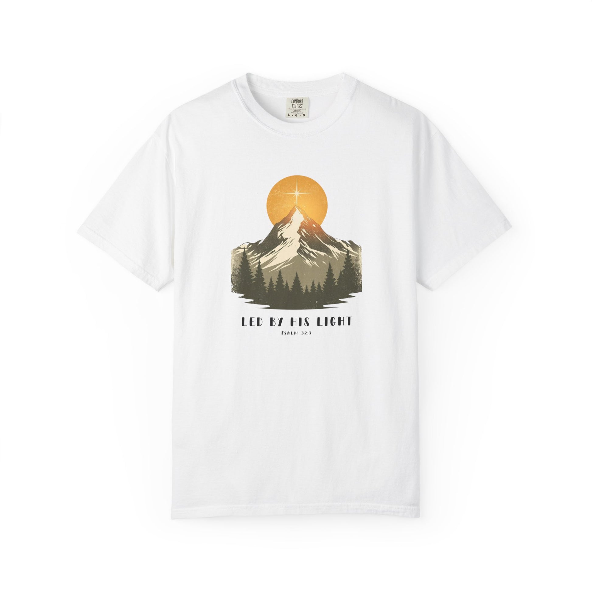 This relaxed-fit garment-dyed tee carries a quiet, reflective vibe — a sunlit mountain rising above a dark forest with the phrase “Guided by His Light.” The soft, broken-in texture of the fabric and muted print colors give the design a lived-in, vintage feel that reads like a personal emblem for mornings spent at trailheads, church retreats, or slow coffee and prayer. It settles comfortably on the shoulders and moves with you — whether you’re layering it under a flannel for cool evenings or wearing it alone to let the message sit close to the heart. The artwork feels like a small, wearable reminder of direction and calm, blending outdoor imagery and faith without shouting. It’s simple, steady, and made to become part of an everyday rhythm.